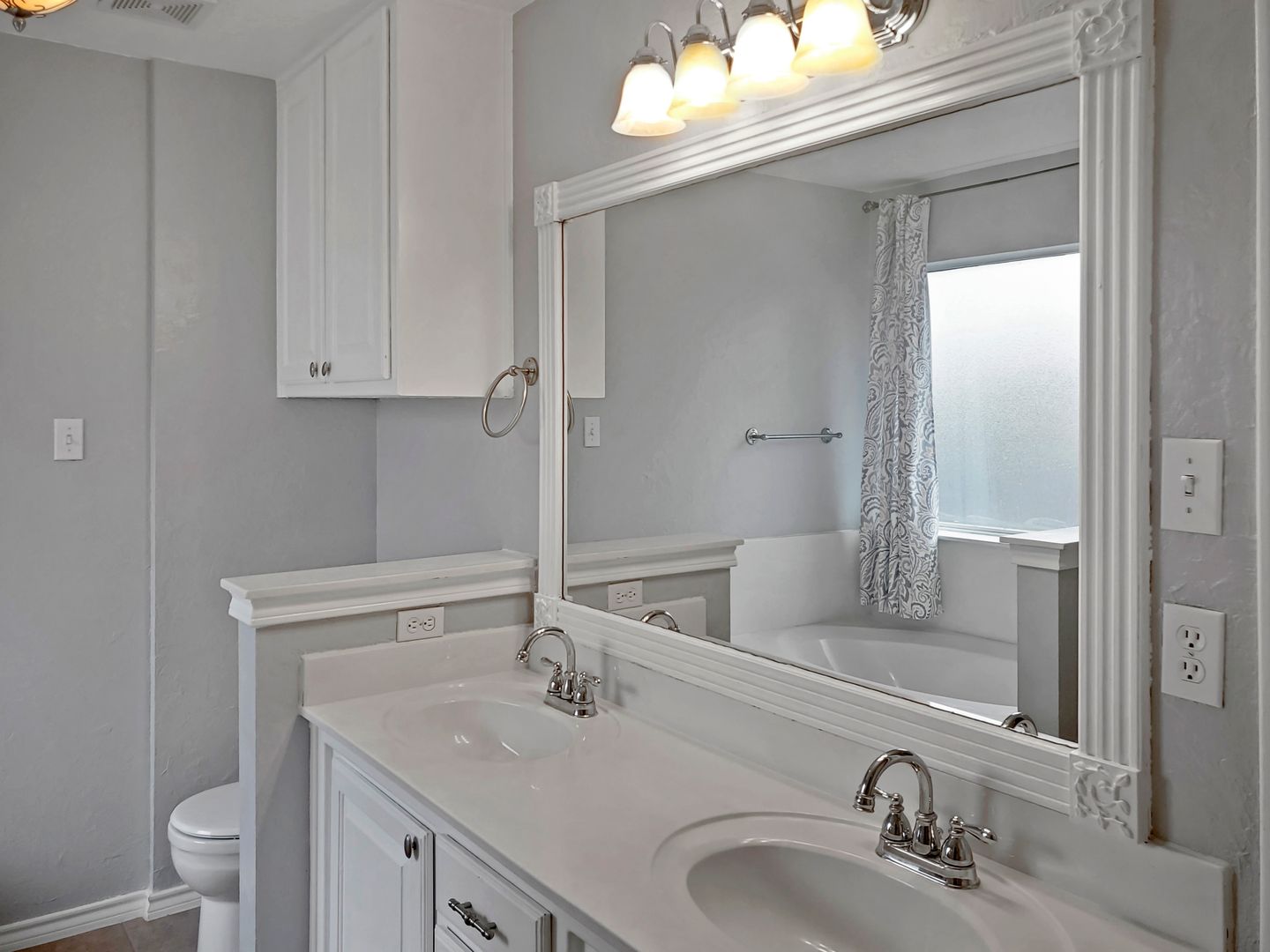 The modern kitchen is well-appointed with a double-oven range and convection microwave. The spacious primary bathroom offers a luxurious soaking tub, dual sinks, and an oversized custom closet.