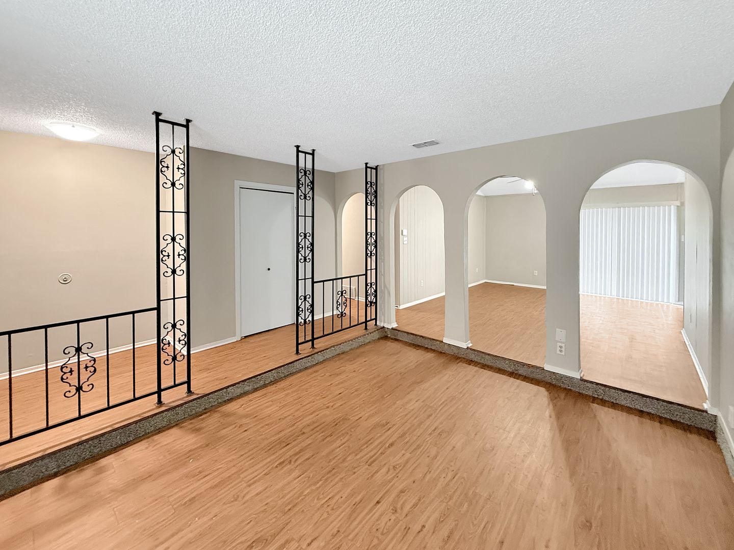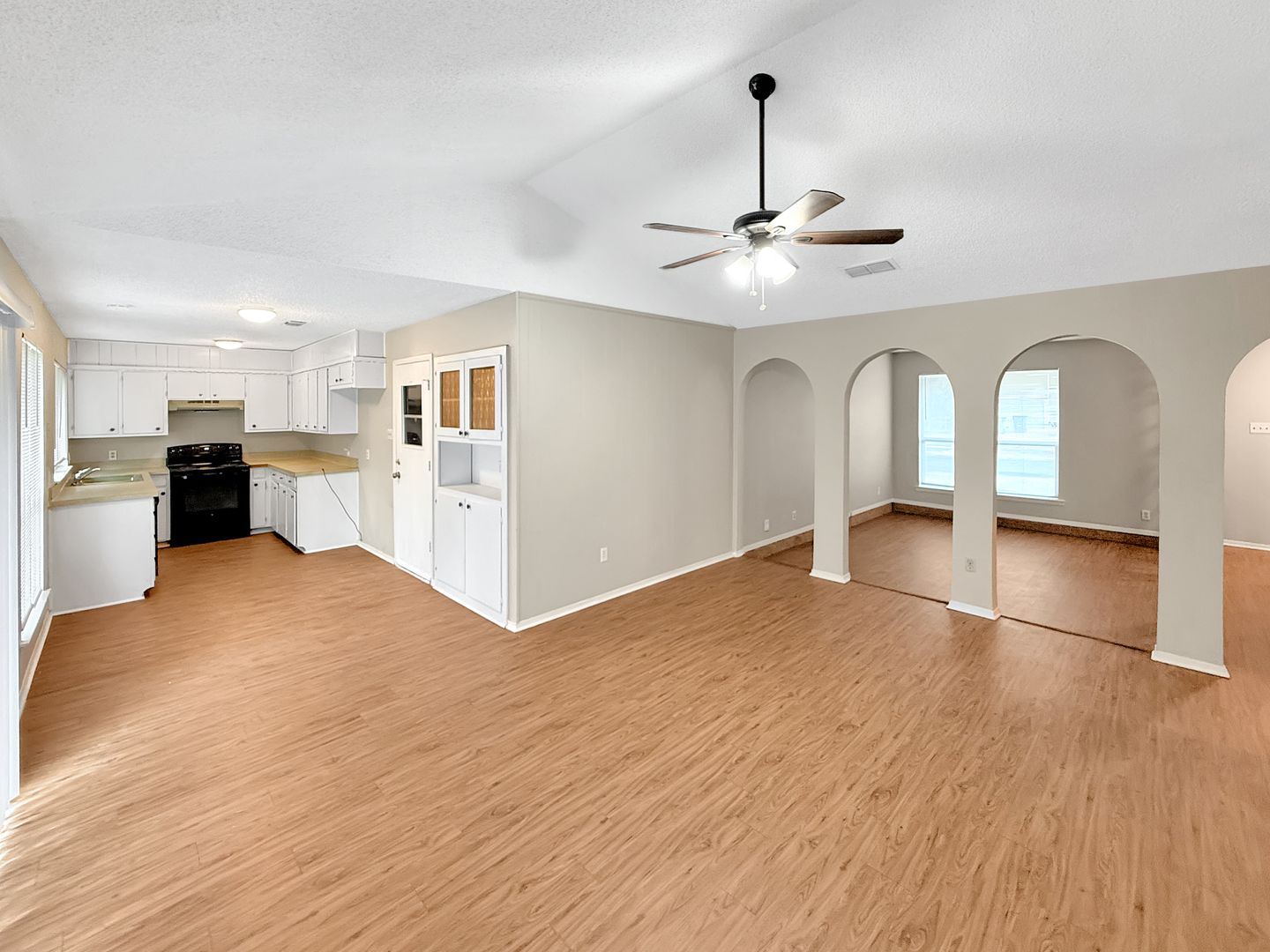 Inside, you’ll find an inviting layout featuring soaring ceilings, elegant archways, and a bright, open-concept living and dining area that brings a modern touch to this classic home. The split-bedroom floorplan offers privacy and flexibility, ideal for families, roommates, or anyone working or learning from home. The primary suite includes a full en-suite bath, while the two secondary bedrooms share a second full bath.