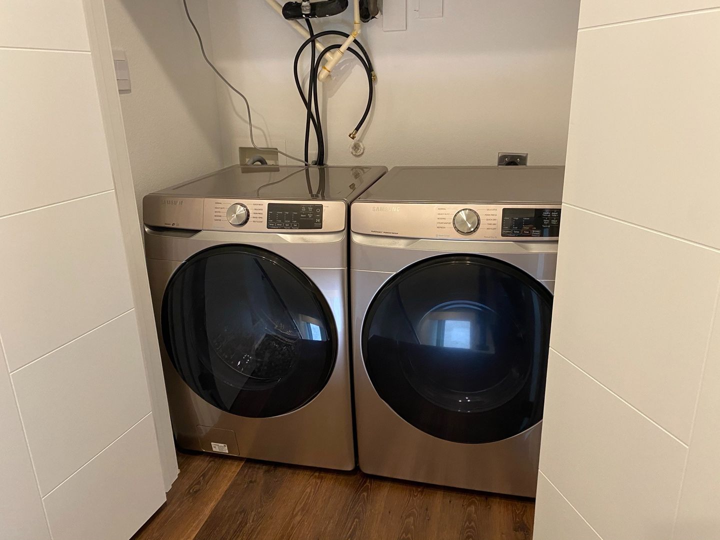 Upstairs, both spacious bedrooms boast high ceilings, abundant natural light, and private en-suite bathrooms. A full-size washer and dryer are included in the second-floor utility closet.